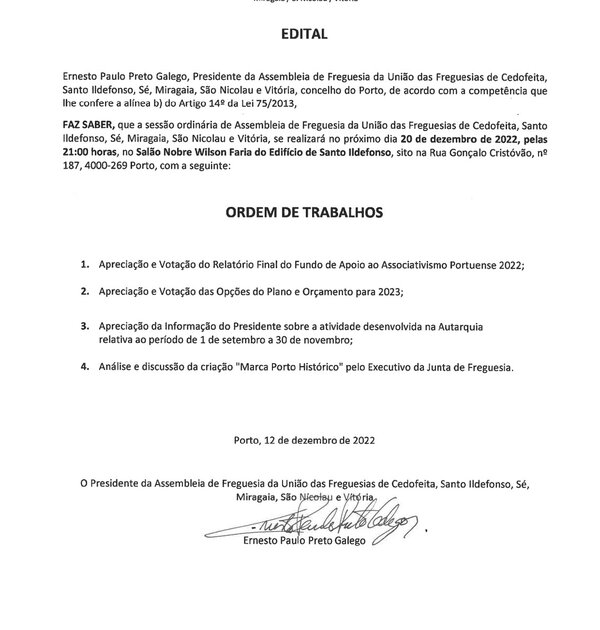 03 Janeiro 2023ASSEMBLEIA DE FREGUESIA EXTRAORDINÁRIA - 6 DE JANEIRO DE 2023