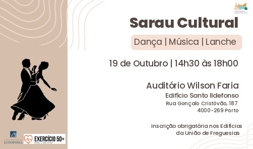 A União Freguesias do Centro Histórico do Porto, convida todos os fregueses a estarem presentes no Sarau Cultural, no âmbito do projeto "Exercício 50+", da Universidade Lusófona, que se irá realizar no próximo dia 19 de Outubro, pelas 14h30m, no Auditório Wilson Faria.