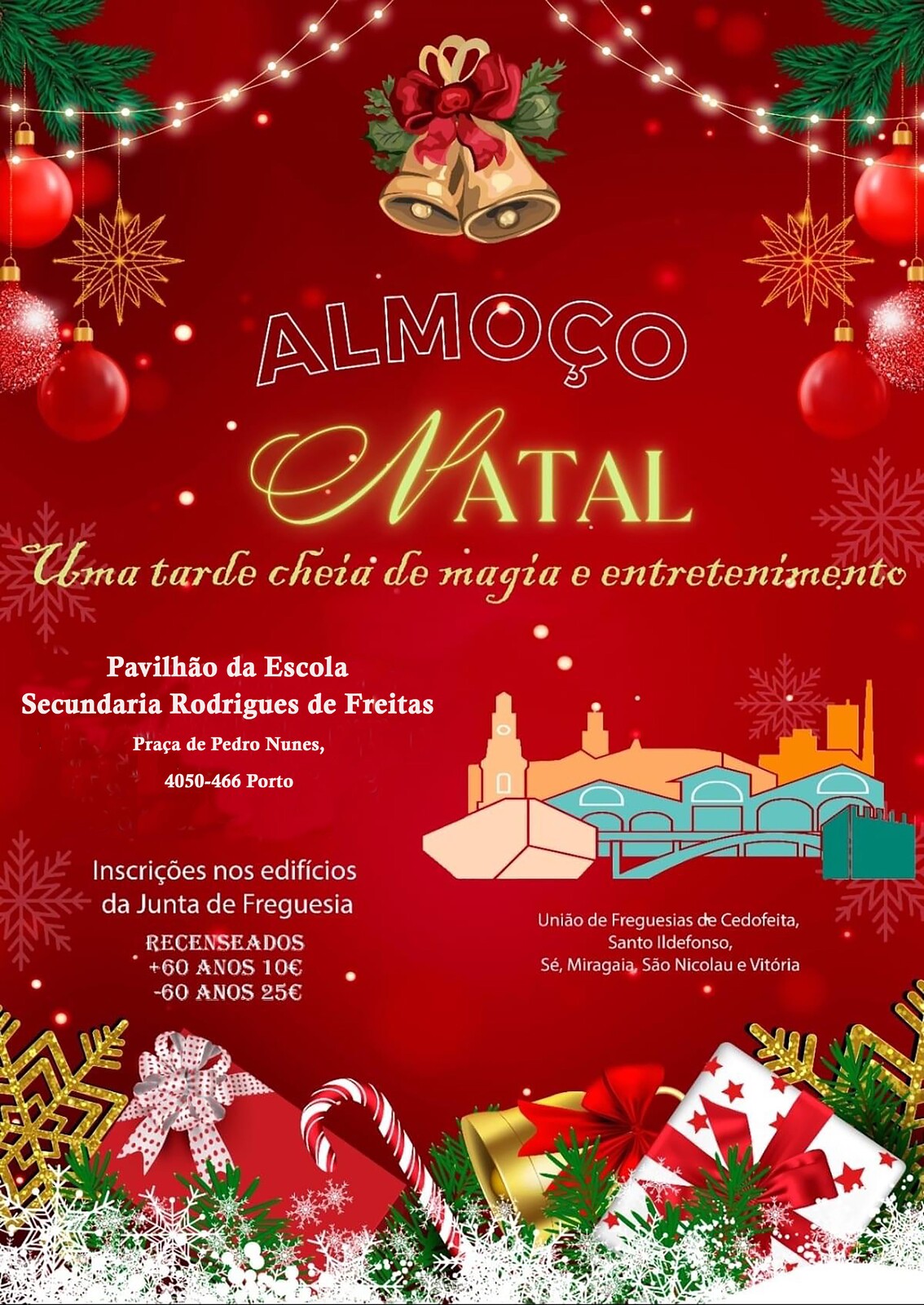 É já no próximo dia 16 de dezembro, pelas 12h, no Pavilhão da Escola Secundária Rodrigues de Freitas, o almoço de natal destinado aos nossos seniores.