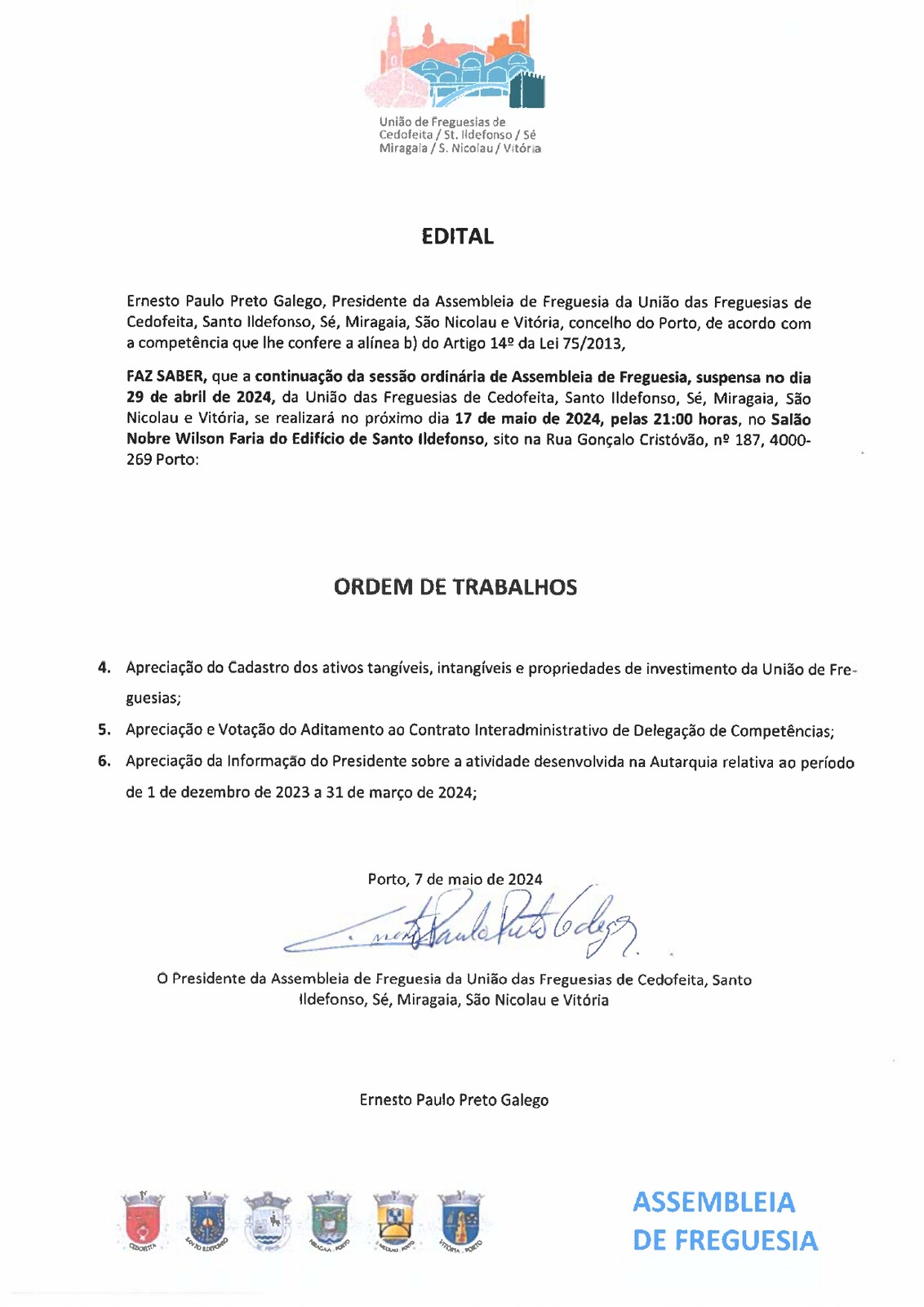 Vai decorrer, no próximo dia 17 de maio, pelas 21h00, no Salão Nobre Wilson Faria do Edifício de Santo Ildefonso, sito na Rua Gonçalo Cristóvão, 187, a Continuaão da Sessão Ordinária da Assembleia de Freguesia de 29 de abril.