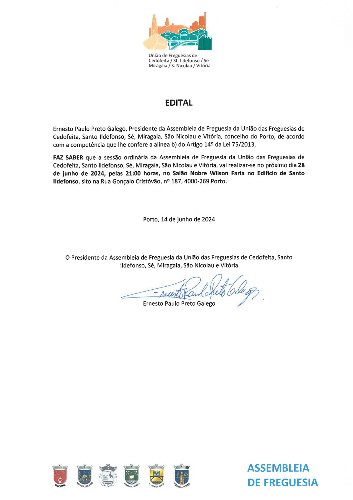 Vai decorrer, no próximo dia 28 de junho, pelas 21h00, no Salão Nobre Wilson Faria do Edifício de Santo Ildefonso, sito na Rua Gonçalo Cristóvão, 187, a Sessão da Assembleia de Freguesia.