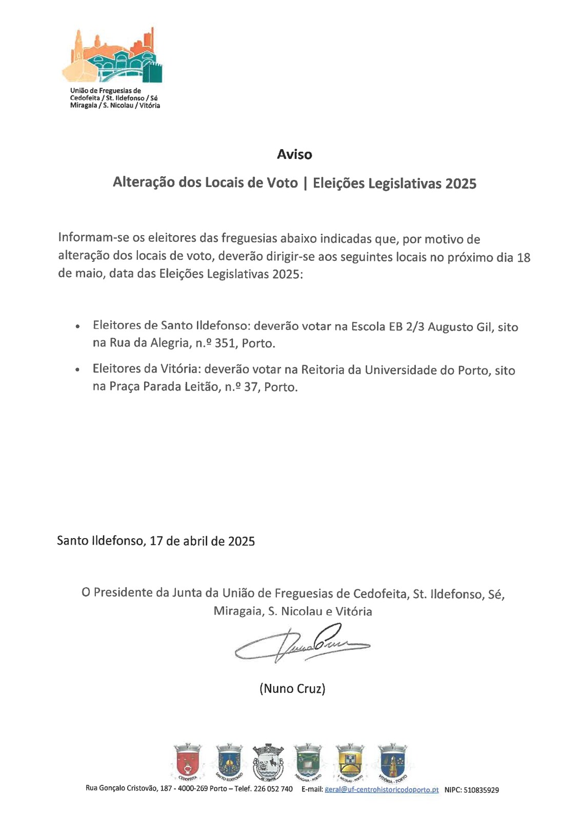 Informam-se os eleitores das freguesias abaixo indicadas que, por motivo de alteração dos locais de voto, deverão dirigir-se aos seguintes locais no próximo dia 18 de maio, data das Eleições Legislativas 2025: