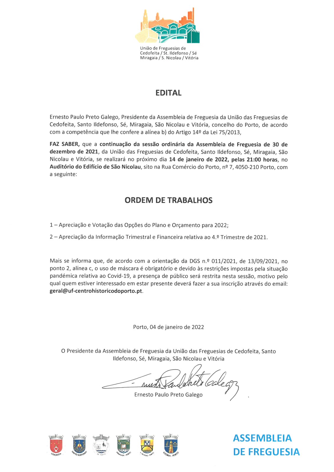 Vai decorrer, no próximo dia 14 de Janeiro pelas 21h00, no Auditório do Edíficio de São Nicolau, sito na Rua Comércio do Porto, n.º 7, a continuação da Sessão Ordinária da Assembleia de Freguesia de 30 de Dezembro de 2021.