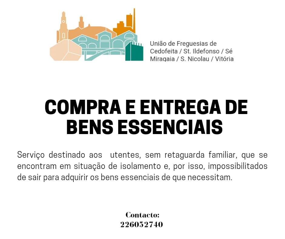 Neste sentido, a Junta da União de Freguesias de Cedofeita, Santo Ildefonso, Sé, Miragaia, São Nicolau e Vitória disponibilizou um serviço gratuito para os fregueses que se encontram nesta situação, o qual assegura a compra e o transporte de bens essenciais com entrega ao domicílio.