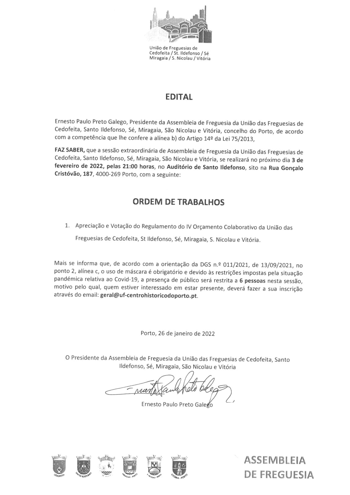 Vai decorrer, no próximo dia 3 de Fevereiro pelas 21h00, no Auditório do Edifício de Santo Ildefonso, sito na Rua Gonçalo Cristóvão, 187, a Sessão Extraordinária da Assembleia de Freguesia.
