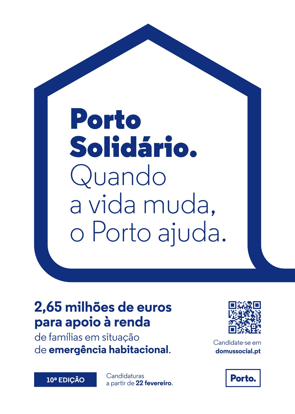 Informamos que no próximo dia 22 de fevereiro de 2022, abrirá um novo período de candidaturas ao programa Porto Solidário – Fundo Municipal de Emergência Social, eixo de Apoio à Habitação, no montante de 2.650.000 € (dois milhões seiscentos e cinquenta mil euros/24 meses).