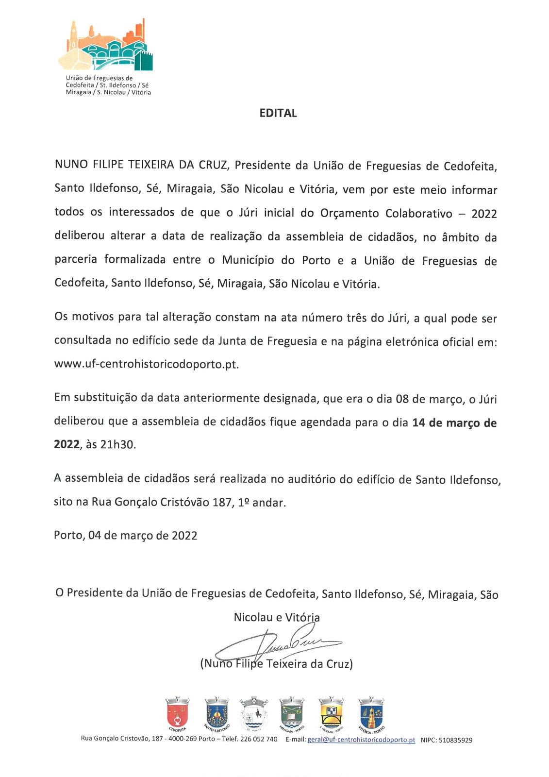 Em substiuição da data anteriormente designada, que era o dia 08 de março, o Júri deliberou que a assembleia de cidadãos fique agendada para o dia 14 de março de 2022, às 21h30, no auditório do edifício de Santo Ildefonso, sito na Rua Gonçalo Cristóvão, nº 187 - 1º andar.