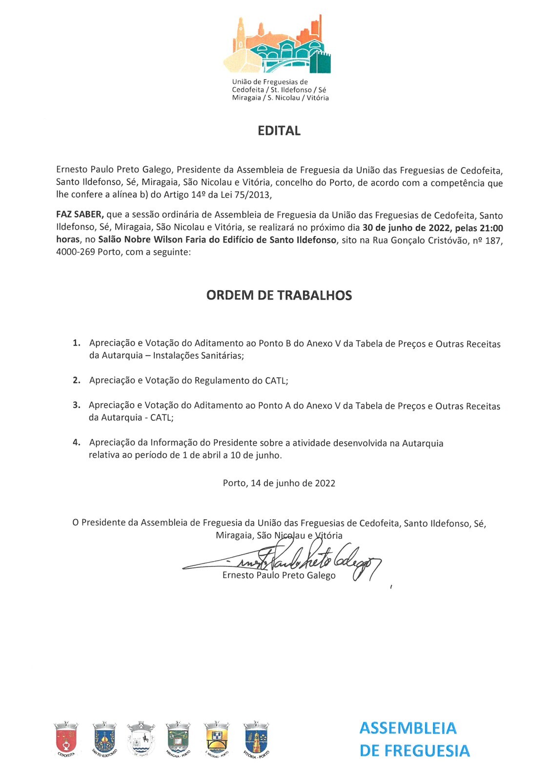 Vai decorrer, no próximo dia 30 de junho pelas 21h00, no Salão Nobre Wilson Faria do Edifício de Santo Ildefonso, sito na Rua Gonçalo Cristóvão, 187, a Sessão Ordinária da Assembleia de Freguesia.