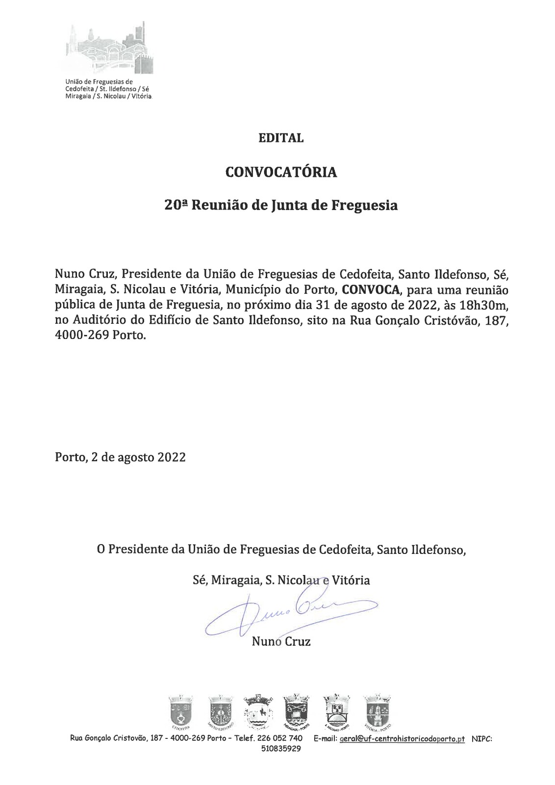 Vai decorrer, no dia 31 de agosto pelas 18h30, no Auditório do Edifício de Santo Ildefonso, sito na Rua Gonçalo Cristóvão, 187, a Reunião Pública de Executivo. Convocatória 20ª Reunião