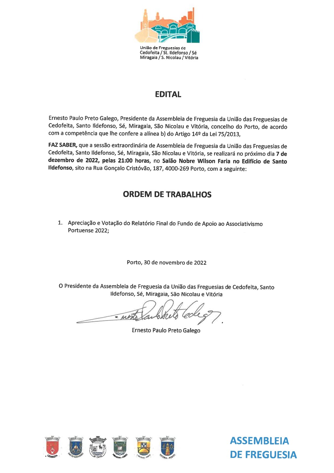 Vai decorrer, no próximo dia 7 de dezembro pelas 21h00, no Salão Nobre Wilson Faria do Edifício de Santo Ildefonso, sito na Rua Gonçalo Cristóvão, 187, a Sessão Extraordinária da Assembleia de Freguesia.