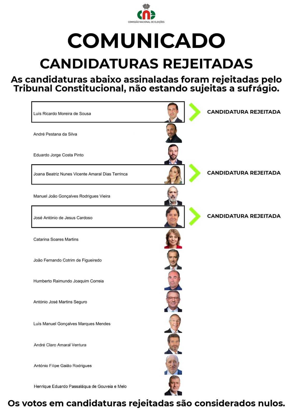 Informa-se que algumas candidaturas foram rejeitadas pelo Tribunal Constitucional, não estando sujeitas a sufrágio.