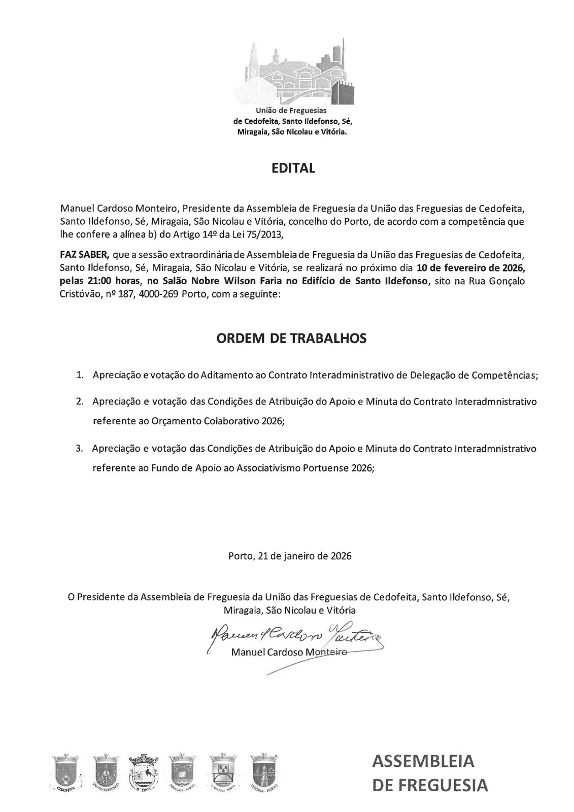 Vai decorrer, no próximo dia 10 de fevereiro, pelas 21h00, no Salão Nobre Wilson Faria do Edifício de Santo Ildefonso, sito na Rua Gonçalo Cristóvão, 187, a Sessão da Extraordinária da Assembleia de Freguesia.